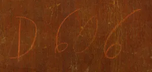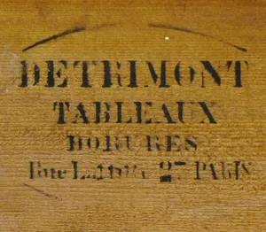 Na odwrocie obrazu duży owalny stempel paryskiej galerii i składu materiałów malarskich Louisa Latouche: TOILES TABLEAUX et COULEURS | LATOUCHE | 34. Rue de Lafayette, 34 | ENCADRE MANTS. Napis czerwoną kredką: D 606. Z tyłu na ramie stempel: DETRIMONT | TABLEAUX | DORURES | /../ La/.../: 27 PARIS