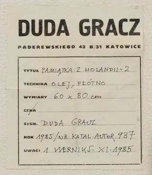 Na odwrocie na płótnie fragment gazety z artykułem opisującym pobyt Dudy Gracza w mieście Zwijndrecht (Holandia) z dwoma zdjęciami artysty i zdjęciem prezentowanego obrazu. W prawym dolnym rogu nalepka autorska: DUDA GRACZ | PADEREWSKIEGO 42 B/31 KATOWICE | TYTUŁ PAMIĄTKA Z HOLANDII – 2 | TECHNIKA OLEJ, PŁÓTNO | WYMIARY 60 x 80 cm | CENA | SYGN. DUDA GRACZ | ROK 1985 / NR KATAL. AUTOR. 937 | Uwagi 1. WERNIKS. XI. 1985