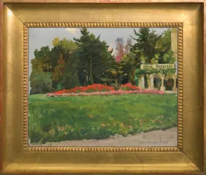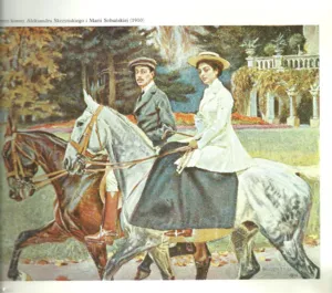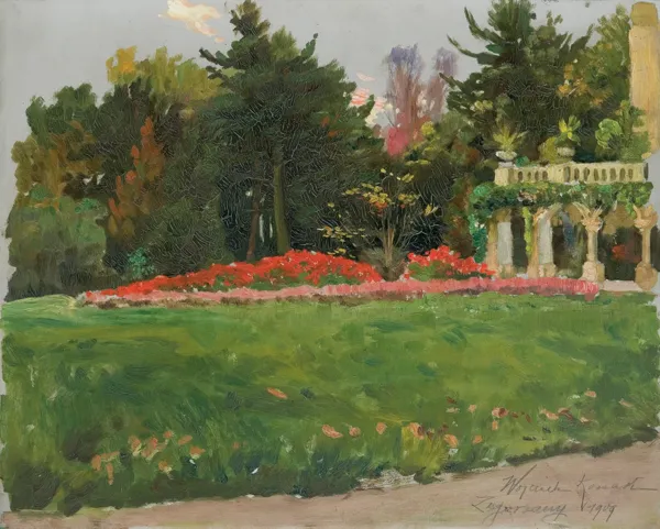 Obraz powstał jako jeden ze szkiców do Konnego portretu Aleksandra hr. Skrzyńskiego i hr. Marii ze Skrzyńskich Sobańskiej na tle pałacu w Zagórzanach, 1910. Ujęty tu motyw z loggią pałacową, gazonem czerwonych kwiatów i zielenią parku znalazł się w tle obrazu (repr. m.in. w: K. Olszański, Wojciech Kossak, Wyd. Ossolineum, Wrocław 1990, il. barwna 307).