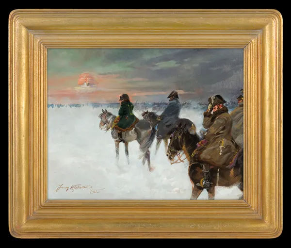 Odwrót Wielkiej Armii spod Moskwy, z brnącymi przez śniegi żołnierzami, którym w obłokach jawi się głowa egipskiego Sfinksa, jest jedną z najpopularniejszych oryginalnych kompozycji Jerzego Kossaka. Artysta malował ten motyw kilkakrotnie, jedna z wersji znajduje się w zbiorach Muzeum Narodowego w Warszawie (porównaj: K. Olszański, Jerzy Kossak, Wrocław 1992). Prezentowany obraz jest późniejszą redakcją tego ulubi...
