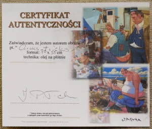 Na odwrocie na płótnie przyklejony certyfikat autentyczności podpisany przez autora.