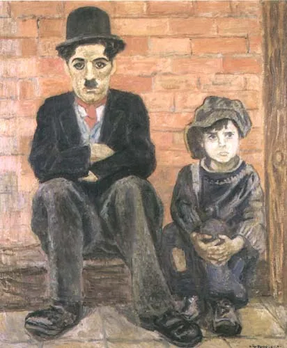 Obraz przedstawia Charlesa Chaplina jako Charlie-trampa i Jackiego Coogana jako tytułowego Brzdąca