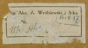 Na odwrocie nalepka znanej warszawskiej firmy zajmującej się przeprowadzkami i magazynowaniem mebli (druk, atrament, ołówek) o treści: Sp. Akc. A. Wróblewski i S-ka | Nr. 16.4.37 | Wp. A[...]