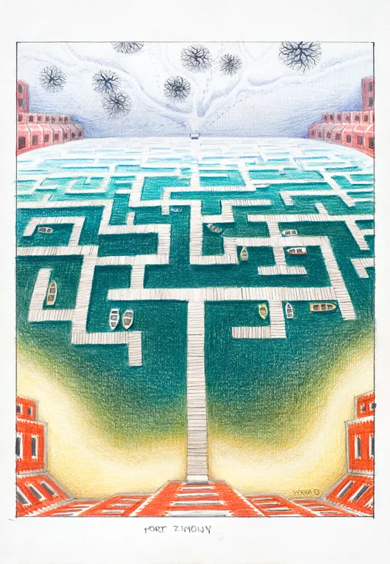 sygn. oł. śr.d. pod kadrem rys.: PORT ZIMOWY, p.d. [w kadrze]: YERKA 13