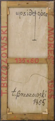 sygn. na odwrocie na płótnie: upside (strzałka) góra | t. Brzozowski. | 1965, na krośnie: T. BRZOZOWSKI | „MORES“ 1965. | 135 x 60