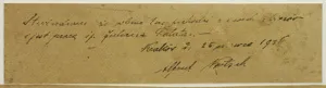 Na tzw. plecach naklejone dwa tekturowe fragmenty oryginalnej oprawy z odręcznymi napisami: -1. Stwierdzam, że obraz Juliana Fałata | sprzedałem p. Gutt/...../ | Kraków d. 28?5. 936 Alfred Kutsch [całość przekreślona]; - 2. Stwierdzam, że obraz ten pochodzi z moich zbiorów | i jest pracą śp. Juliana Fałata. - | Kraków d. 25 czerwca 1936 | Alfred Kutsch