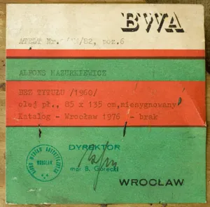 Na blejtramie l.d. nalepka: BWA | Atest Nr 1/AM/82, poz. 6 | ALFONS MAZURKIEWICZ | BEZ TYTUŁU (1960) | olej, pł. 85 x 135 cm, niesygnowany | Katalog - Wrocław 1976 - brak | okrągła pieczątka Dyrektor | [podpis] | mgr B. Górecki | WROCŁAW