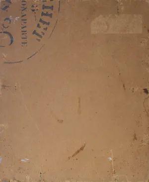 Tektura podłoża wycięta z większego arkusza; na odwrocie fragment stempla (o kształcie palety) paryskiej firmy BLANCHET z materiałami malarskimi z zachowaną częścią napisu: [BLANC]HET / [3]8 / [RUE B] ONAPARTE / [PARI]S.