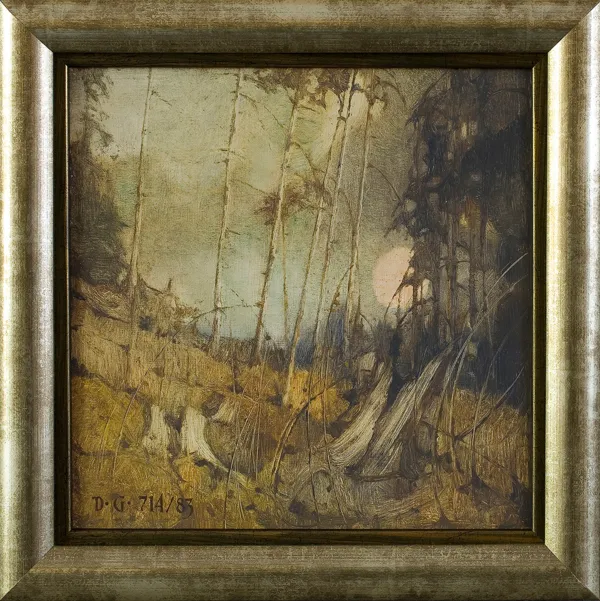 Na odwrocie na płycie nalepka autorska: DUDA GRACZ | PADEREWSKIEGO 42 B /31 KATOWICE |TYTUŁ BRZEGI-KWIECIEŃ 4 | TECHNIKA OLEJ, PŁ. PILŚN. | WYMIARY 26,5 x 26 cm | CENA... | SYGN. DUDA GRACZ |ROK 1983/NR.KATAL.AUTOR. 714| UWAGI 1 WERNIKS. XII. 1983