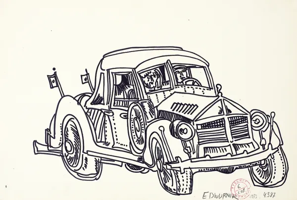 na odwr. p.d. pieczątka wypełniona oł.: EDWARD DWURNIK 1973 | CYKL 70 [w kółku] Pojazdy. | TYTUŁ Ekipa | WYMIARY | TECHNIKA; p.g. data oł.: 9. IX. 73.; obok: 121 [w trójkącie]