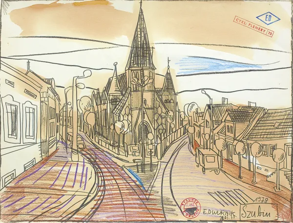 na odwr. p.d. pieczątka wypełniona oł.: EDWARD DWURNIK 1978. | CYKL 70 [w kółku] | TYTUŁ Szubin – kościół. | WYMIARY – 38 x 50 | TECHNIKA ołówek, herbata; p.g. oł.: 106 [w trójkącie]