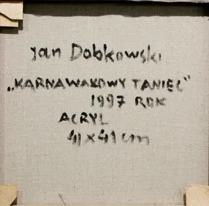 sygn. na odwrocie na płótnie: Jan Dobkowski | „KARNAWAŁOWY TANIEC“ | 1997 ROK | ACRYL | 41 x 41 cm