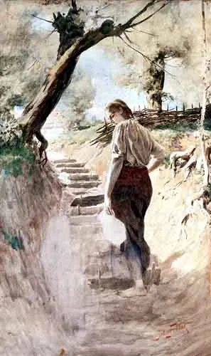 Dziewczyna z dzbanem to jedna z nielicznych znanych dziś wczesnych prac Fałata, powstała już po jego powrocie do kraju w roku 1882. Artysta zamieszkał wówczas w Warszawie, skąd dwukrotnie – w roku 1882 i 1883 – wyjeżdżał na Litwę. Wyjazdy te wspominał później w swoich Pamiętnikach:„Rzeka Dubissa dała mi wiele motywów; namalowałem też wiele głów i typów [..] i malowałem wiele, przebywając całymi dniami nad Świtezią, w Tuhanowiczach i w Worończy. Z tej wycieczki przywioz...