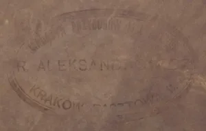 ponadto owalny stempel krakowskiego magazynu ram i materiałów malarskich Róży Aleksandrowicz (ul. Basztowa 11)