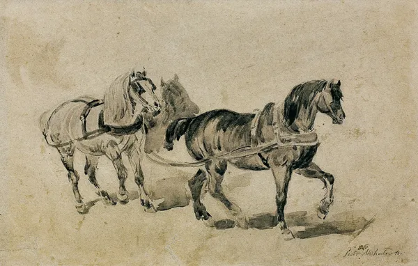 Rysunek powstał zapewne w latach 1844-1845, kiedy to artysta odwiedził swego teścia w jego majątku Les Maderes koło Tours we Francji. Wówczas - jak pisze córka artysty - „powstały owe konie z takim wysiłkiem ciągnące ładowne wozy, a do których wzoru dostarczały podobne zaprzęgi na wybrzeżach Ligiery...“ (cyt. za: C. Michałowska: Piotr Michałowski, Kraków 1911, s. 75).