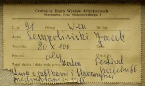 W prawym górnym rogu nalepka: Centralne Biuro Wystaw Artystycznych | Warszawa, Plac Małachowskiego 3 | L.p. 91 Okręg W-wa... | Autor Sempoliński Jacek | Technika 80 x 100... | Format olej | Tytuł dzieła i data wyk. pracy... Festiwal | Szczecin 66 | ...tura z jabłkami i blaszanymi | przedmiot...