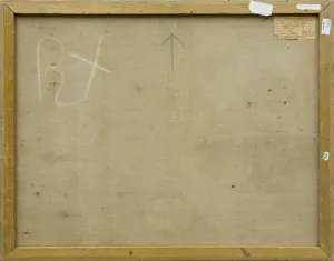 Na krośnie napis autorski: M. natura z jabłkami i przedmiotami blaszanymi | Sempoliński; na płótnie napis RX oraz pionowa strzałka.