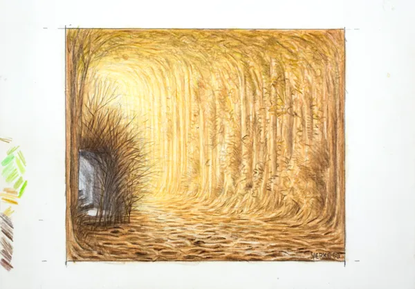 sygn. oł. p.d.: w kadrze kompozycji: YERKA 09, na odwr. p.d: JACEK YERKA | »ZŁOTA ALEJA«, na lewym marginesie próbki kredek