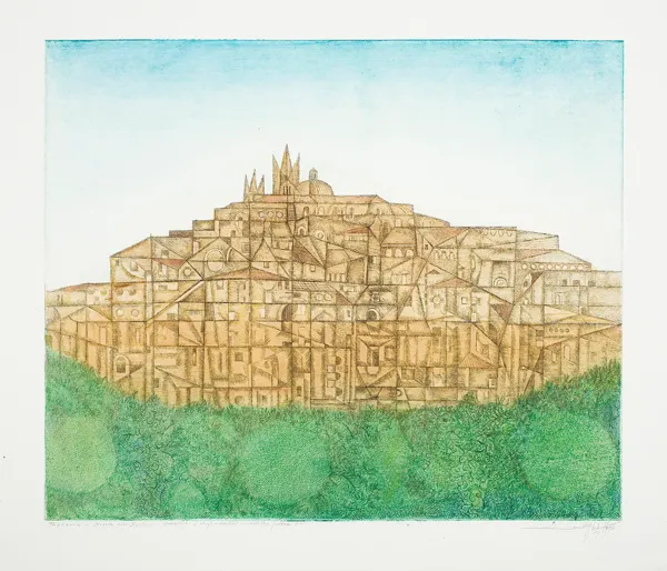 sygn. oł. pod ryc. l.: Toskania - Miasto albo Siena - akwaforta + akryl + kredki - odbitka próbna 4-, l.: LeszekRózga imp. IV /1994