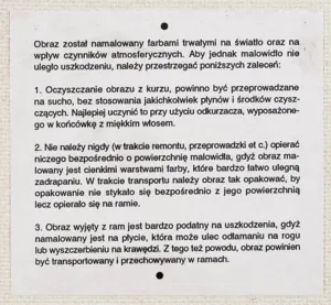 na płycie kartka z zaleceniami dot., m.in. konserwacji obrazu