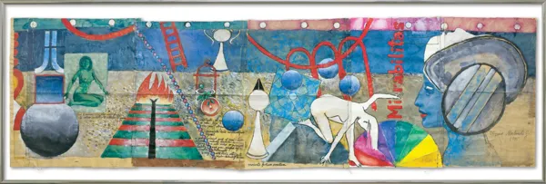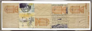 akwarela, gwasz, tusz pióro, papier czerpany beżowy z nadrukami firmowymi Cepelii na odwr., zszywany cienkim sznurkiem