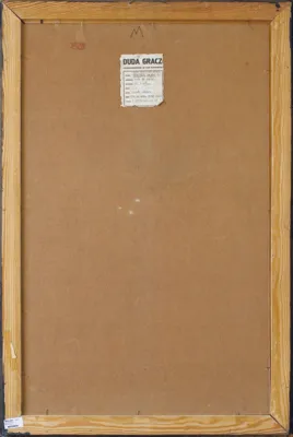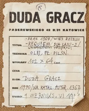 Na odwrocie na płycie nalepka autorska: DUDA GRACZ | PADEREWSKIEGO 42 B/31 KATOWICE | TYTUŁ OBRAZ 1367/WIEŚ BRZEGI | - REQUIEM DLA LASU - 2 | WŁADYSŁAWOWI HASIOROWI | TECHNIKA OLEJ, PŁ. PILŚN. | WYMIARY 102 x 64 cm | CENA... | SYGN. DUDA GRACZ | ROK 1990/NR KATAL. AUTOR. 1367 | UWAGI 1 WERNIKS. VI 1991 oraz podłużna mało czytelna pieczątka.