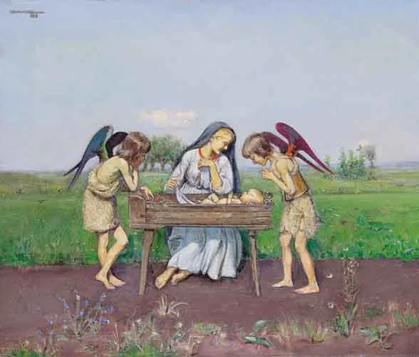 Zainteresowanie Hofmana tematami religijnymi, a zwłaszcza wątkiem maryjnym, znajduje wyraz w całej jego twórczości. Artysta inspirując się sztuką średniowieczną i wczesnorenesansową, kompozycjami typu Sacra Connversatione oraz polskim folklorem tworzy własny, rozpoznawalny – „hofmanowski” typ przedstawień Madonny z Dzieciątkiem. Jedną z redakcji tego tematu są sceny Adoracji Dzieciątka, rozgrywające się na ogół w polskim krajobrazie – przed wiejską chatą lub na ukwieconej łące z dalekimi drzewami. Tak jest i w prezentowanym obrazie, urzekającym prostotą i czułością, wyczuwalną w gestach i wyrazie postaci ludowej, dziewczęcej, Madonny i towarzyszących jej chłopców – Aniołów. Obraz pochodzi z wczesnego, najbardziej twórczego okresu działalności artysty, a umieszczona na nim naklejka wskazuje, że w roku 1913 był eksponowany w warszawskiej Zachęcie.