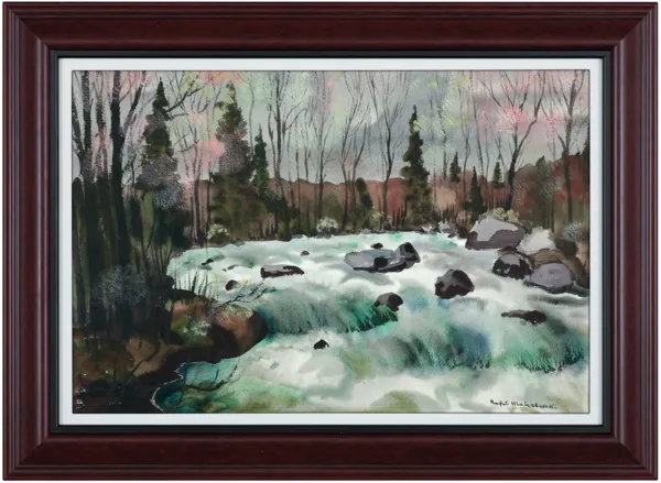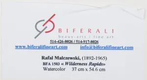 Na odwrocie - na oprawie - nalepka firmowa: Biferali Beaux Arts / Fine Art z opisem obrazu i tytułem "Wilderness Rapids"