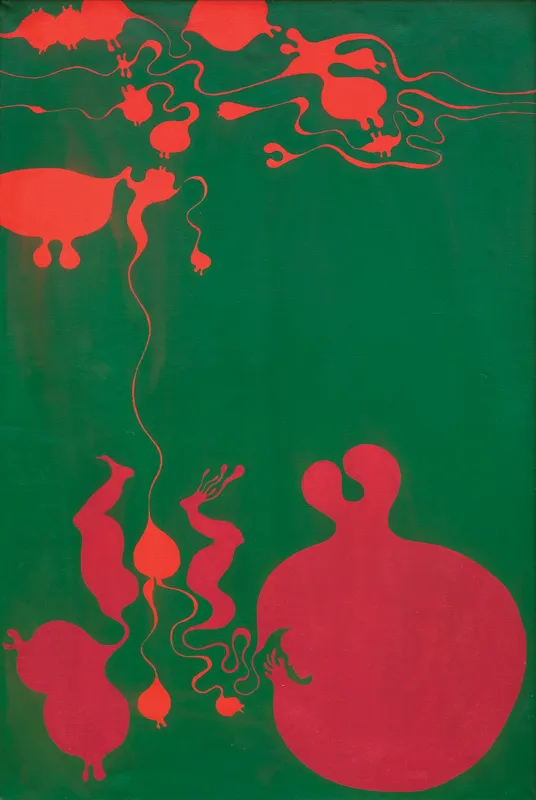 Obraz powstał w czasie, gdy Jan Dobkowski wspólnie z Jerzym Zielińskim (Jurrym) tworzyli grupę NEO-NEO-NEO. Dobkowski stworzył wtedy serię płasko malowanych obrazów, których kompozycja wypełniona była kontrastowo zestawioną czerwienią i zielenią. Janusz Zagrodzki pisał: Malarstwo NEO-NEO-NEO można odczytać nie tylko jako wszechstronny manifest radości istnienia, lecz jako sposób na życie w sztuce, formie, kolorze, gdzie ciągle coś Kwitnie, Owocuje, Wschodzi, Opada, a lapidarność znaku, bogactwo a przede wszystkim intensywność barw ułatwia Smakowanie, Rozkosz, Oczekiwanie, Pożądanie. Czasem rodzi się Grzech następuje Wygnanie z raju nadlatuje Gołąb niepokoju lub zaczyna się Życie od nowa.