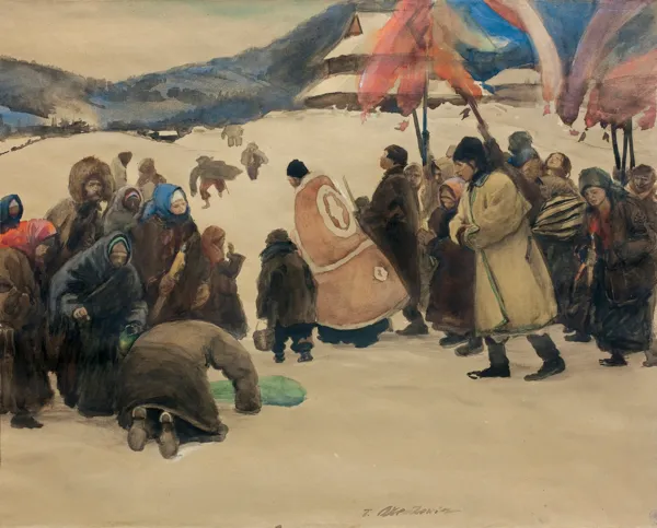 Teodor Axentowicz był jednym z pierwszych polskich artystów malujących, tak później popularne obrazy z życia Hucułów. Motywy huculskie powtarzał w wielu wariantach i układach kompozycyjnych, malowanych olejno, akwarelą bądź pastelami. Prezentowany obraz przedstawia - również wielokrotnie powtarzany - epizod ze świątecznych uroczystości obchodzonych w kościele prawosławnym i greko-katolickim w Dzień Objawienie Pańskiego (...