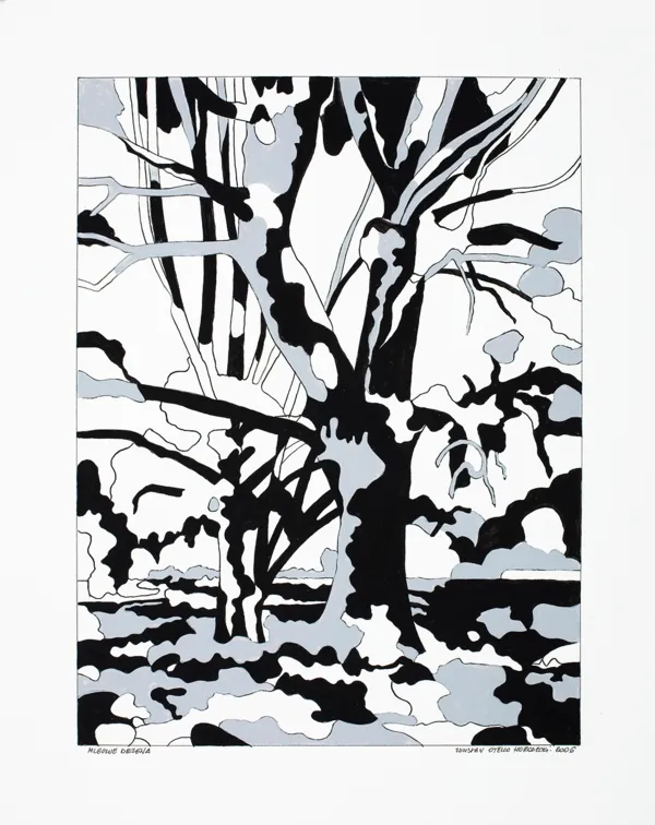 sygn. tuszem l.d.: MLECZNE DRZEWA, p.d.: ZDZISŁAW OTELLO HORODECKI, na odwr.: „MLECZNE DZREWA” | ZDZISŁAW OTELLO HORODECKI | AKRYL/KARTON | [znak aut.]