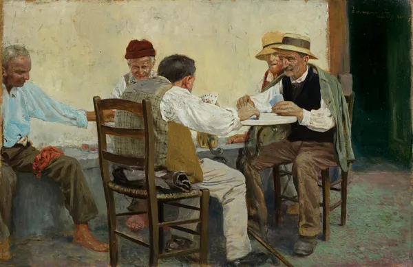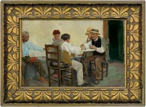 - [po bokach dwukrotnie:] Towarzystwo Zachęty Sztuk Pięknych w Król. POLSK. | No 7253 | Nazwisko Wygrzywalski | F | Rodzaj dzieła olejny | Tytuł Partya kart | Wymiar- | Cena lub jego wartość- | Własność Autora | Adres - | Warszawa d. 2/15 I 906