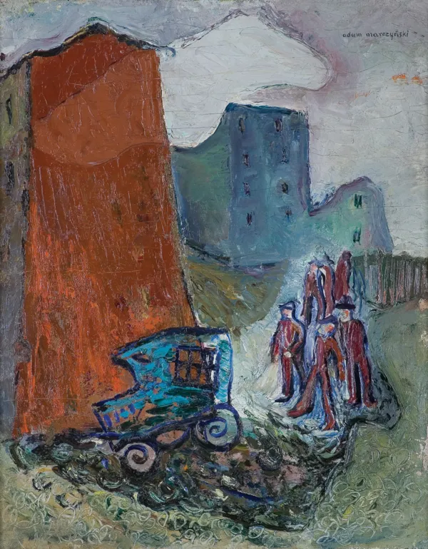 Prezentowany na wystawie obraz "Pejzaż industrialny", powstał tuż po okresie studiów artysty w Akademii Sztuk Pięknych w Krakowie, podczas których był on luźno związany z awangardowym, zaangażowanym politycznie środowiskiem Grupy Krakowskiej. Nierealistyczne, mroczne przedstawienie przemysłowego miasta zawiera w sobie element charakterystycznej dla członków Grupy społecznej wrażliwości: Marczyński portretuje w nim scenę z życia klasy robotniczej, która w latach 30. ciężko odczuwała skutki kryzysu ekonomicznego w Polsce. Artysta podchodzi do tematu w osobisty, autorski sposób: maluje go w dużym formacie, nawiązuje do postimpresjonizmu, stosuje uproszczone, syntetyczne formy i stara się oddziaływać kolorami i fakturą obrazu. (https://nigdywiecej.artmuseum.pl/pl/artysta/adam-marczynski)