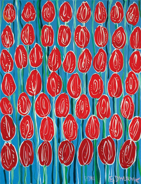 na odwrocie na płótnie sygnatura i napis: 2014 | E. DWURNIK | „CZERWONE | TULIPANY“ | NR: XXIII [w ramce] - 658 – 5101 [w ramce]