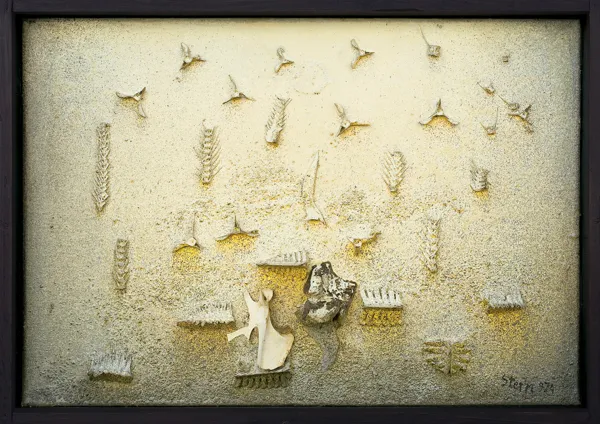 „Sam Stern najchętniej budował własne światy złożone z nieokreślonych kształtów kojarzących się ze światem organicznym. Wykorzystywał ich metaforyczną energię i łączył ze sobą w nierealistyczne całości. Płynące w tajemniczej przestrzeni na poły abstrakcyjne formy akcentowały surrealistyczny klimat przedstawień. Cecha ta charakteryzuje wiele prac artysty, bez względu na technikę ich wykonania. Podobną aurę roztaczają także kompozycje, w których szczególnie zostało podkreślone znaczenie samej faktury: bądź w sposób czysto malarski, bądź też przez zastosowanie techniki kolażu. Zwłaszcza ostatnie prace są oryginalnym osiągnięciem artysty. Chociaż stosował w nich konwencjonalne metody, napiętnował je silnie znakami osobistych, konkretnych doświadczeń. Do nich odnoszą się wykorzystywane w pracach substancje, „pozyskiwane“ z otoczenia, na drodze życia: kawałki zwykłych szmat, naklejane na płaszczyznę obrazu, cząstki organiczne (głównie rybie ości i skóry, drobne kości), jak również - pojawiające się niczym stygmaty - świadectwa żydowskiej przynależności (w postaci fotografii z przeszłości czy tałesów). Nadają one dziełom wymiar eschatologiczny. U Sterna bowiem pozornie mechaniczny gest montowania na podłożu drobnych przedmiotów lub organicznych „resztek“ ma znaczenie symboliczne. Wynika z doświadczeń wojennych i mającego w nich swoje źródło przekonania o nietrwałości życia i nieuchronności śmierci. Umieszczane w zaszklonych kasetonach elementy nie są jednak bezosobowymi śladami minionego czasu, ale wręcz osobowymi - bo związanymi z konkretnym, indywidualnym doświadczeniem - świadkami. Pełnią rolę epitafiów i zarazem relikwiarzy. Szczątki zwierząt stają się tutaj także rodzajem pamiątek po człowieku. Ślady, które „rejestrował“ Stern, stanowią wszakże pamiątki niejako w dwójnasób: są rzeczywistymi „dowodami na istnienie“ konkretnego człowieka (rybie szczątki to pozostałości wędkarskich wypraw, które były pasją malarza...“