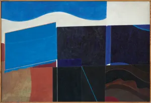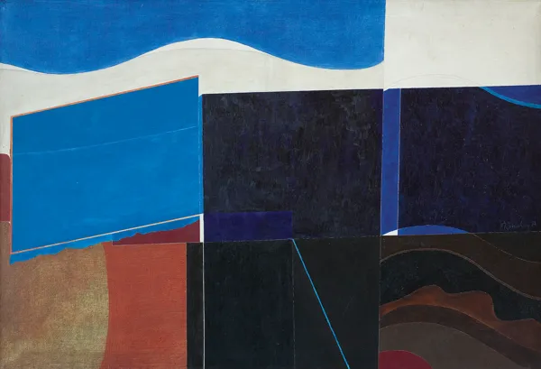 na odwrocie na płótnie po prawej sygnowany i opisany: WŁODZIMIERZ JAN ZAKRZEWSKI JR. 1974 | OBRAZ Z NIEBIESKIM OBŁOKIEM | (Z DWOMA BIAŁYMI PIONAMI) „FALA“ | 97 x 146 Oil on canvas “Wave“