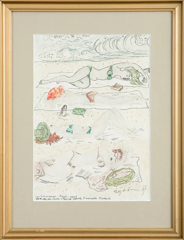 sygn. dłg. p.d.: majaber 67, l.d. napis dłg.: Jan Sztaudynger: Podaż i popyt | Leżycie na plaży w leniwej podaży I marzycie o popycie