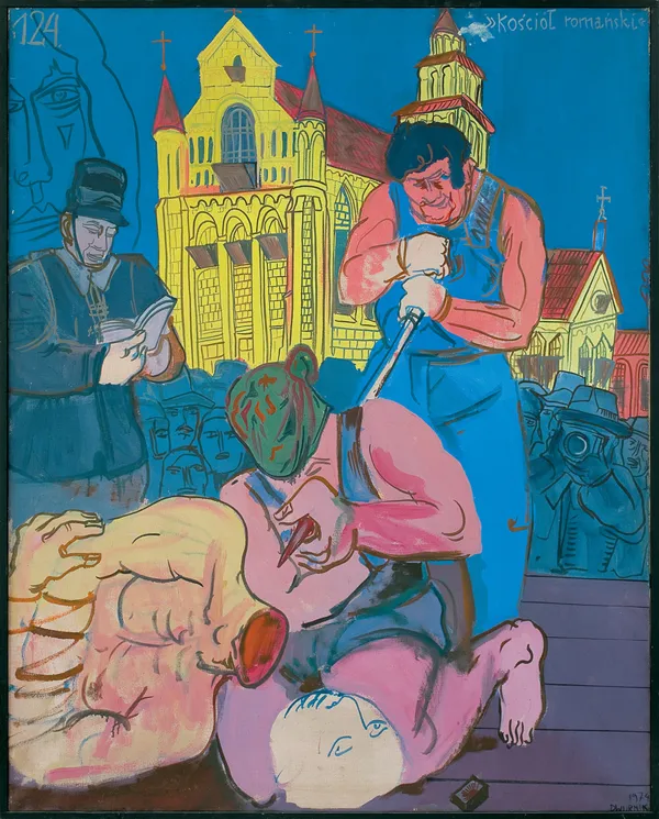 - 1. 9. XII 1974 r.| IV [w kółku] Chmury | Kościół romański | 146 x 114. | akryl, olej, płótno | NR: 124.