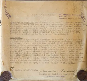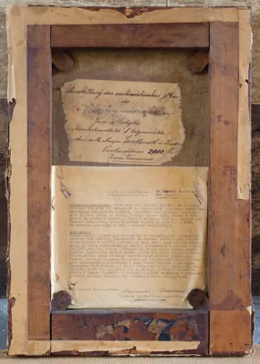 Poniżej naklejona karta z tekstem orzeczenia dr Kazimierza Buczkowskiego potwierdzającego autorstwo Jana Matejki, podającego historię obrazu oraz stosowną literaturę. Orzeczenie wydane zostało w Krakowie, dn. 30 lipca 1946 roku.