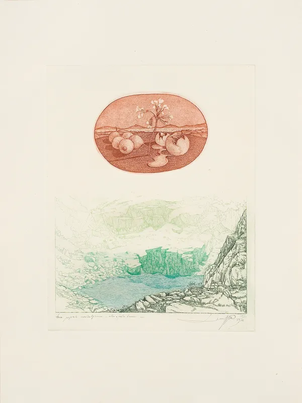 sygn. oł. pod ryc. l.: Dwa pejzaże nostalgiczne - akwaforta barwna -, p.: LeszekRózga imp./1976