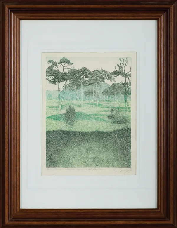 sygn. z płyty pod kadrem kompozycji p.d.: LR | 76 | VII, sygn. oł. pod kadrem kompozycji w obrębie odcisku płyty l.: Pejzaż wiosenny – akwaforta barwna – odb. próbna. –, p.: LeszekRózga VII /1976