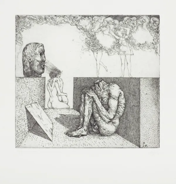 sygn. z płyty p.d.: LR [monogram wiązany] | I-69 [w odbiciu lustrzanym], sygn. oł. pod ryc. l.: Intymność – akwaforta 20/30, p.: LeszekRózga I/69 | imp.
