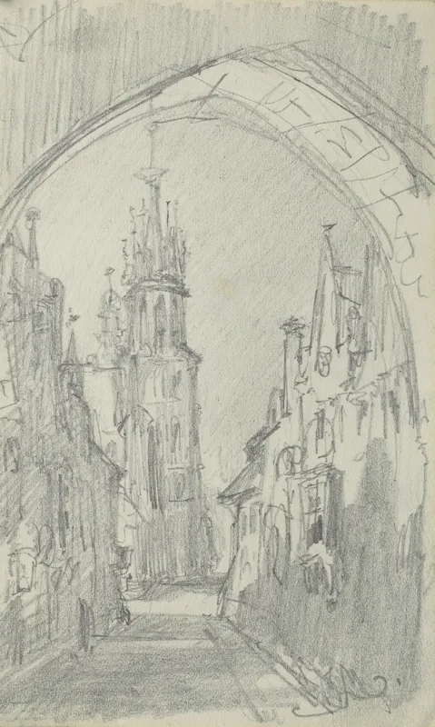 pełny tytuł: ULICA FLORIAŃSKA W KRAKOWIE Z WIDOKIEM NA KOŚCIÓŁ MARIACKI
