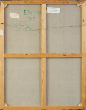 na lewej listwie krosna nalepka informacyjna w jęz. niemieckim z tytułem, danymi obrazu i ceną