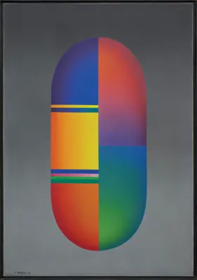 „Na obrazach pojawiają się najprostsze kształty geometryczne: koła, trójkąty czy kwadraty malowane zawsze płasko, bardzo precyzyjnie, czystym kolorem, z wyraźnie zaznaczonym konturem. Barwy i ich zestawienia ostre, często zaskakujące, traktowane są jako określone zjawiska fizyczne. Obrazy te albo wywołują zamierzone powidoki albo są rozmaitymi rozwiązaniami dopełnień kolorystycznych, opartych na zasadzie symultanicznego kontrastu barw i prawie refleksów. Jednakże w wielu pracach wyczuć można bardzo emocjonalny stosunek autora do koloru i jego sensualnych wartości.“