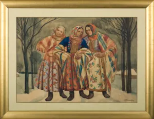 Postacie góralek są na obu obrazach bliźniaczo podobne, jedynie zamienione miejscami. Takie budowanie kompozycji z identycznych figur w różnych konfiguracjach było dla Skoczylasa charakterystyczne. Zabiegi te artysta stosował często także w grafice: - przykładem mogą być, późniejsze o kilka lat (po 1922) grupy Dziewek z owocami w wersji akwarelowej (patrz j.w.: kat. VI. 131 i 132) i drzeworytniczej (patrz j.w.: kat. III. 132). Z kolei tło, w obu kompozycjach różne, w przypadku oferowanej pracy przypomina Wieś góralską (1909), inną akwarelę z wczesnego okresu (patrz: kat. VI. 15; chodzi tu o opracowanie drzew, a także charakterystyczną „żabią“ perspektywę).