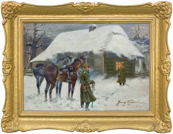 Sygn. p.d.: Jerzy Kossak | 1942Na odwrocie okrągły stempel potwierdzające autorstwo: - w polu środkowym herb „Kos” | Nr ...; w otoku napis: * JERZY KOSSAK * Kraków pl. Kossaka 4