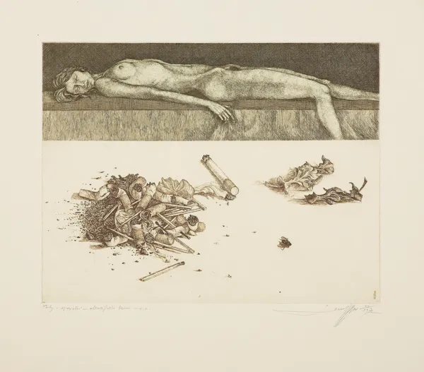 sygn. oł. pod ryc. l.: Pety i ogryzki - akwaforta barwna - e.a., p.: LeszekRózga XII/1972