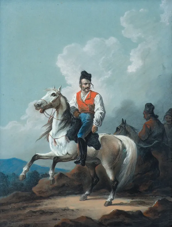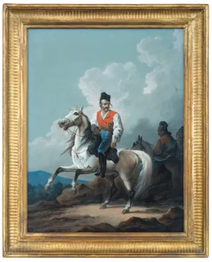 Nad nalepką atest podpisany przez wybitnego rosyjskiego artystę Aleksandra Benois (1870-1960). Tekst napisany atramentem: Excellence pastel absolument autehentique | de peintre Alexandre Orlovsky (1777-1832) | Alexandre Benois | Décembre 1943.