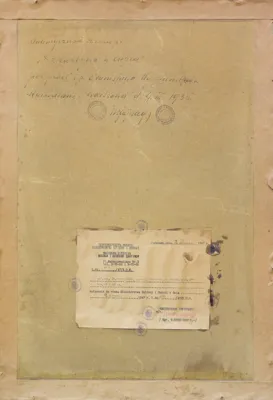 Poniżej naklejona karta - załącznik do zbiorczego pisma Naczelnej Dyrekcji Muzeów i Ochrony Zabytków z dnia 2 sierpnia 1947 roku, zezwalającego na wywóz obrazu za granicę; maszynopis opatrzony podpisem generalnego konserwatora i pięcioma okrągłymi stemplami Ministerstwa Kultury i Sztuki Rzeczypospolitej Polskiej.